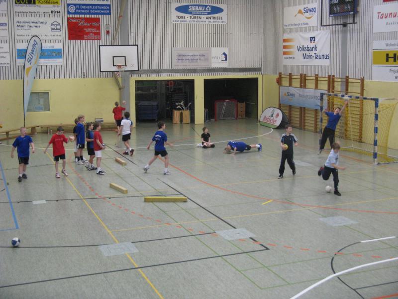Genau die richtige Abwechselung nach den Weihnachtsfeiertagen brachte das dreitägige Süwag-Handballcamp in Münster. Betreut wurde der ambitionierte Handball Nachwuchs vom erfahrenen HSG FrankfurtRheinMain Trainer Konrad Bansa, dem unter anderen die Spieler Andreas Schröder und Tobias Hahn zur Seite standen. Neben individueller Angriff- und Abwehrschulung am Vormittag standen nach dem gemeinsamen Mittagessen abwechslungsreiche Sielformen am Nachmittag auf dem Camp-Programm. Als Überraschung besuchte der ehemalige HSG Spieler Daniel Wernig, der mittlerweile für den Bundesligisten DHC Rheinland auf Torjagd geht, die Jugendlichen und demonstrierte eindrucksvoll die richtige Technik für eine explosive Körpertäuschung. Zur Belohnung für die eifrigen jungen Handballer im Alter zwischen neuen und 13 Jahren gab es am Ende des Camps ein T-Shirt und eine Urkunde.