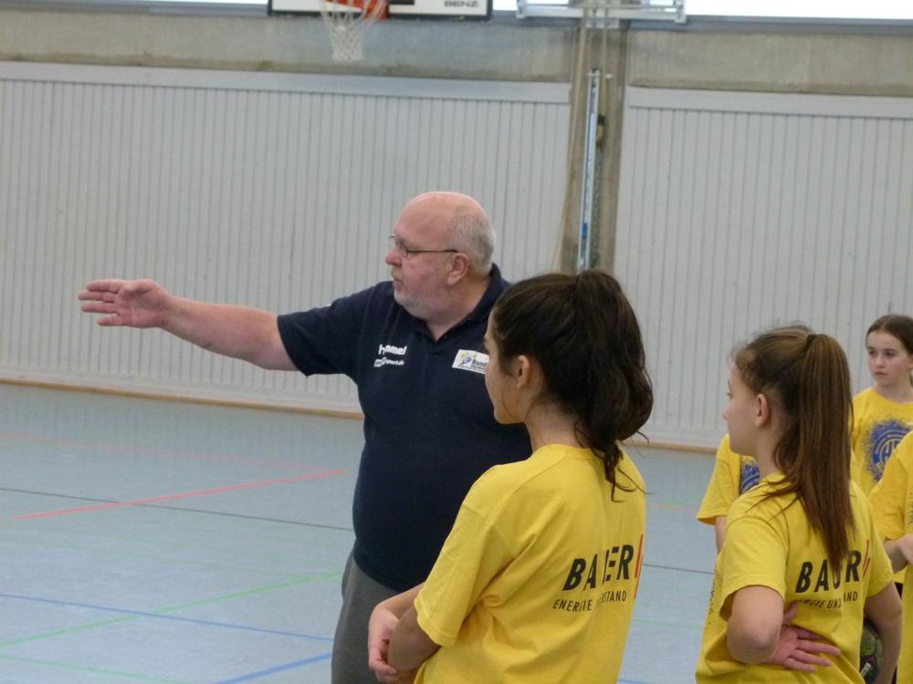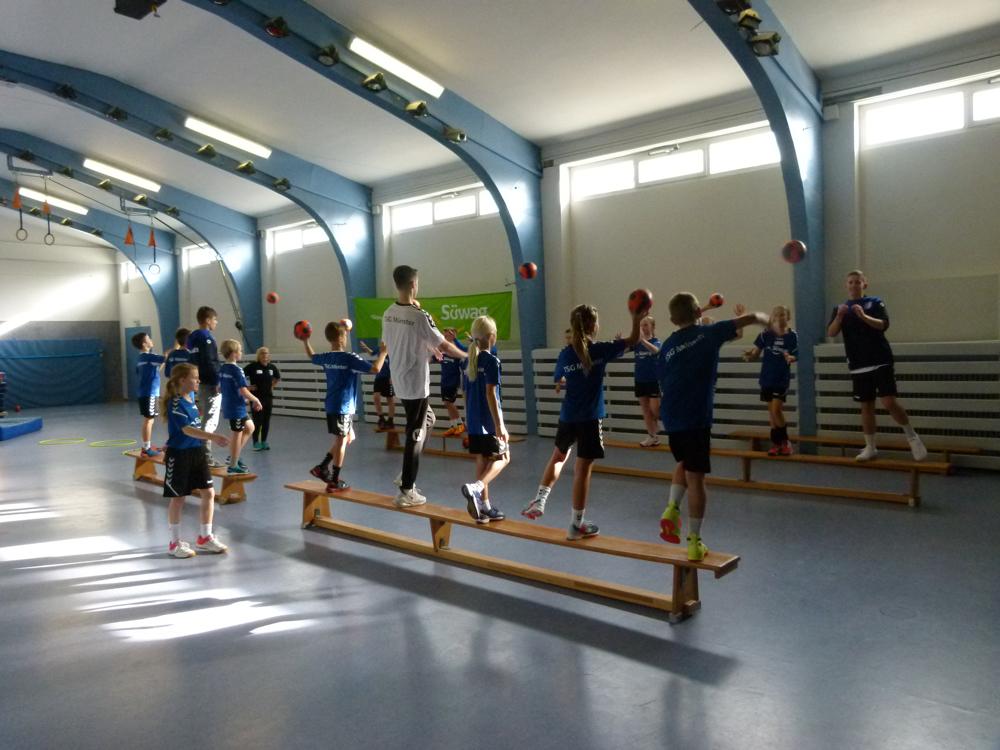 Den Trainingsauftakt in der Waldsporthalle startete morgens um 10.00 Uhr mit dem gemeinsamen Aufwärmen und Einstimmen mit allen Teilnehmern. Danach wurde gruppenweise an vier Stationen mit inhaltlichen Schwerpunkten wie Wurftechnik, Ballhandling, Koordination oder Spielfähigkeit trainiert.