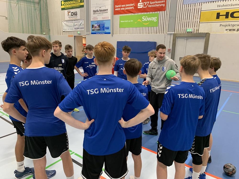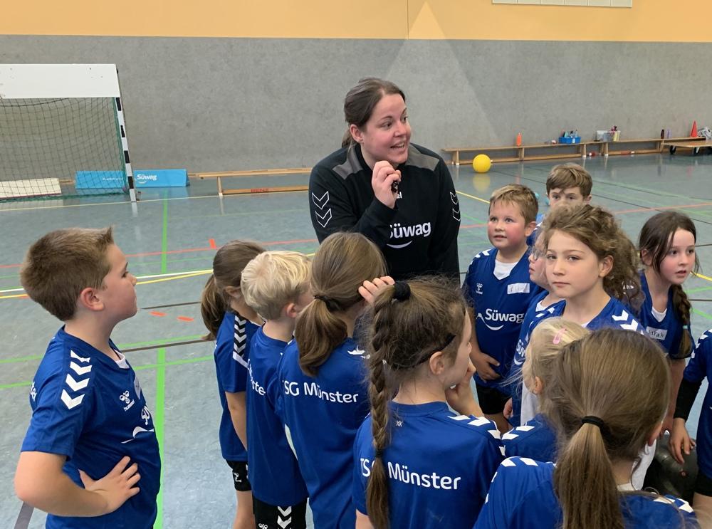 Süwag-Handballcamp Winter 03.-05.01. 2024 bei der TSG Münster Erstmalig fand das Süwag Handballcamp „Winter“ in der ersten Januarwoche statt. Der Nachfrage aus vielen Vereinen schadete dies jedoch nicht, ganz im Gegenteil. 112 Kinder und Jugendliche, verteilt auf 8 Gruppen sorgten dafür, dass die beiden Münsterer Hallen nahezu aus ihren Nähten platzten. So viele Teilnehmer wollten unterhalten werden, deshalb boten erfahrene Jugendtrainer erneut ein vielseitiges und altersadäquates Training an verschiedenen Stationen an. Dabei standen am Vormittag vor allem technisch-taktische sowie athletische Inhalte im Vordergrund, der Nachmittag stand ganz im Zeichen der Spiele.
